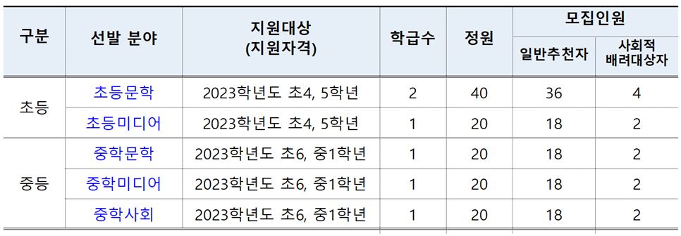 24학년도 경상남도사이버영재교육원에서 영재교육대상자를 선발하고 있습니다. 다음과 같이 영재교육대상자 선발 계획을 안내하니 관심 있는 학생들의 많은 지원을 바랍니다. 1. 분야 및 입학정원  2. GED 온라인 접수: 2023.08.28.(월)~09.15.(금) 3. 교사 관찰 및 추천: 2023.09.16.(토)~11.15.(수) 4. 선발 전형 (시간, 장소 추후 안내) - 영재성 검사: 2023.12.02.(토) - 과제해결 수행관찰: 2023.12.02.(토) 4. 최종 합격자 공지: 2023.12.21.(목) 예정 (학교공문 발송, 홈페이지 알림 없음) ** 문의처: 055-570-5552, 5554